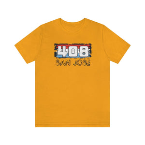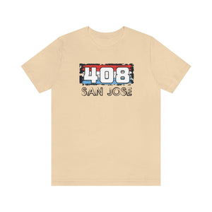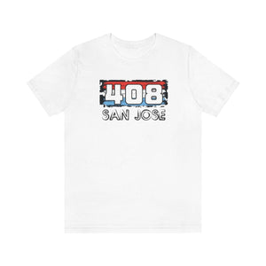 Morning sun filters through palm trees lining the streets of San Jose, where innovation pulses and tradition thrives. The “408” design captures this spirit—the boldness of new ideas framed by the steadfast pride of a community. The red, white, and blue bands behind the numbers echo the city’s roots, a tribute to unity and ambition. Below, the words “SAN JOSE” ground the design in a place where dreams take flight amid tech campuses and taquerias.