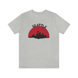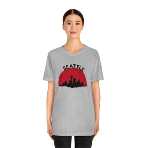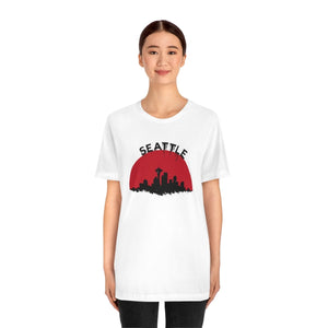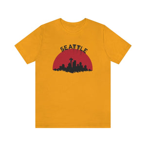 As daylight fades over Seattle, the skyline ignites with hues of amber and violet. This design captures that fleeting moment—the sun hovering low, casting golden light across the cityscape. The word "SEATTLE," bold and stylized, arches above the sun and sky circle, echoing the city's balance of nature and urban grit. It’s a reminder of ferry rides with ocean spray, the smell of roasted coffee, and city streets glistening after rain.