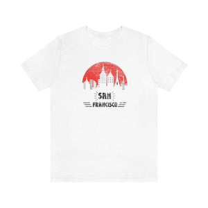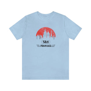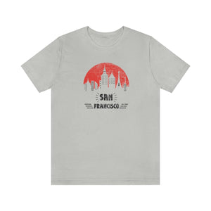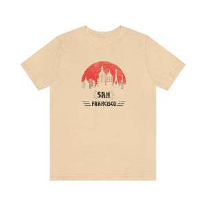 The bold letters stand strong beneath the towering cityscape, much like the streets that pulse with energy day and night. Horizontal lines cut across the design, mirroring the rhythm of movement—cable cars gliding up steep hills, ocean waves crashing along the shore, and the constant hum of life.