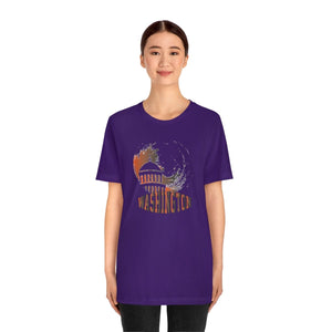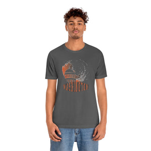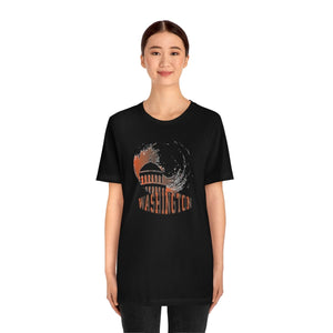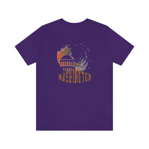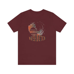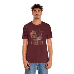 A silhouette, bold yet understated, rises from the fabric, capturing the strength and grandeur of a city built on history. The Capitol Building stands tall within the design, a symbol of power, democracy, and resilience. Wrapped in shades of deep rust and orange, the text below merges with the structure, grounding the composition in an earthy, vintage aesthetic. The contrast between light and shadow creates a sense of depth—almost as if the city itself comes alive in motion.