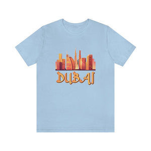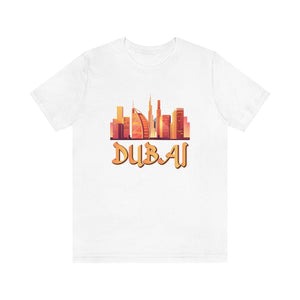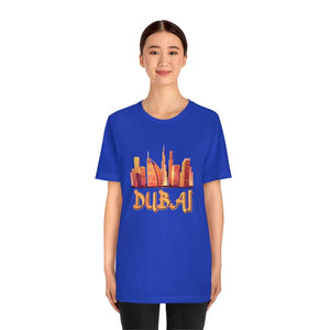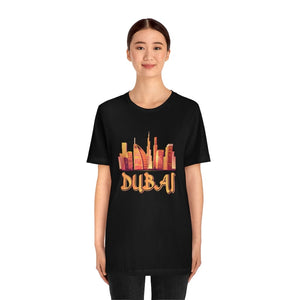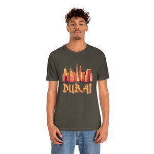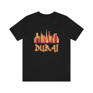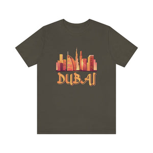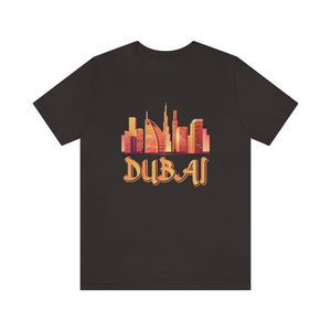 The golden-brown, ornate lettering adds an elegant touch, mirroring the city's lavish spirit and rich cultural heritage. Whether it’s the endless desert dunes or the shimmering skyscrapers that captivate you, this design brings the heart of Dubai to life. Wear the energy, the opulence, and the vision of one of the world’s most iconic cities.