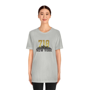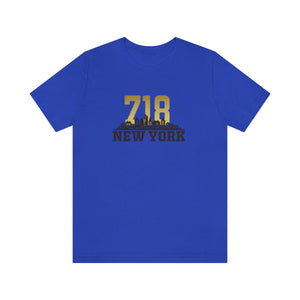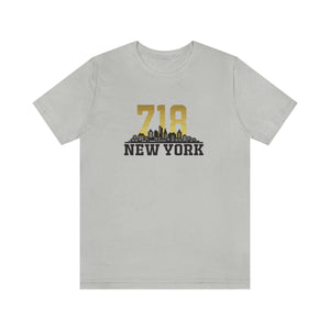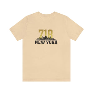 As twilight descends over New York, the skyline transforms into a silhouette of ambition and dreams. The number "718," gleaming in metallic gold, crowns the design—a tribute to the boroughs that pulse with life and legacy. Beneath, the skyline stretches dark and sleek, capturing that moment when city lights awaken and the air hums with possibility.