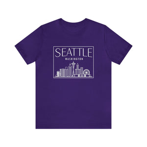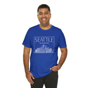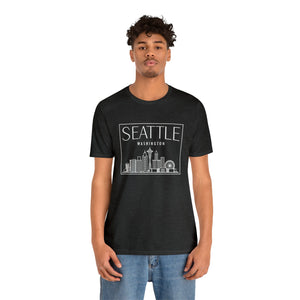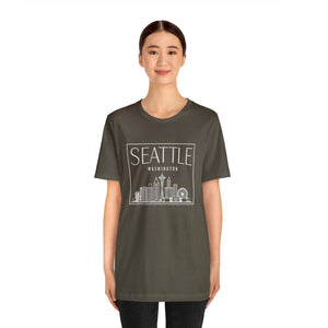 Inspired by the misty mornings and city lights of the Emerald City, this design perfectly captures Seattle's unique rhythm. The bold, sans-serif SEATTLE stands confidently above WASHINGTON, a tribute to the city’s quiet resilience and its ability to thrive under the constant embrace of rain. The skyline stretches upward, its silhouette rising against the ever-changing, moody skies, reflecting the city’s blend of natural beauty and urban vibrancy.