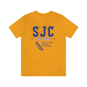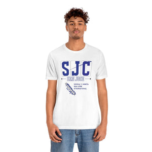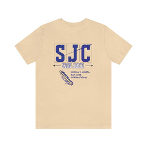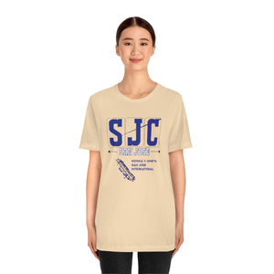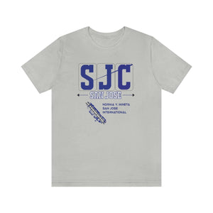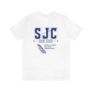 Early morning light glints off the tarmac as planes taxi at San Jose International, their paths tracing lines of arrival and departure. The “SJC” design embodies that energy—the promise of new places and the comfort of homecomings. In deep navy blue, the letters stand bold, anchored by the names “SAN JOSE” and “NORMA Y. MINETA”—a tribute to the city’s spirit and its gateway to the world. Below, the runway graphic captures the precision and motion of takeoff, a reminder of journeys waiting to unfold.
